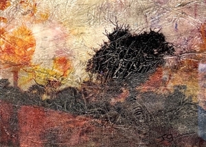 Digital layered photography on Mixed Media and hand painted fabric substrate. 36 x 31cm framed