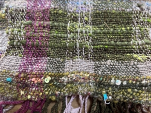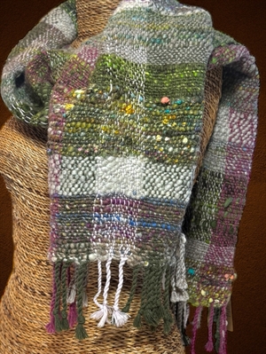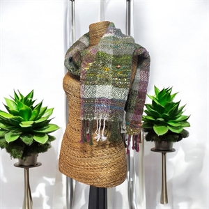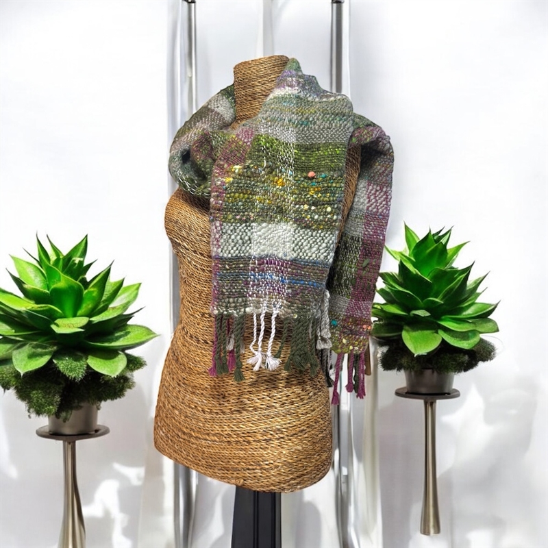 A gentle, earthy handwoven scarf inspired by quiet walks through woodland paths — tones of moss green, heather purple, and soft stone grey woven together in a beautifully balanced design. Flecks of colour and texture catch the light like wildflowers among leaves, creating a subtle depth and movement throughout.