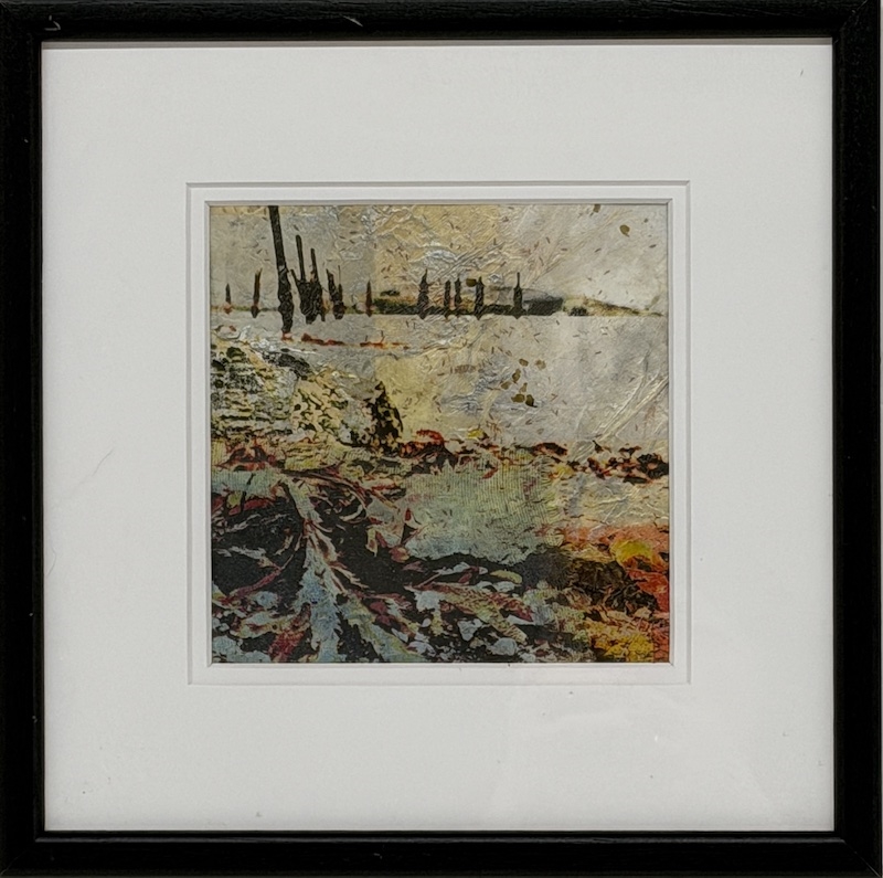 Layered digital photography on mixed media and hand painted fabric substrate. 24x24cm framed