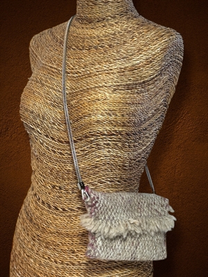 This small handwoven wool shoulder bag combines soft texture with simple elegance. Crafted from natural wool in gentle cream and blush tones, it features a fold-over flap edged with a fringe of unspun fleece — a playful, tactile detail that adds charm and individuality. The compact size makes it ideal for carrying just the essentials, while the silver chain strap offers a contemporary contrast to the natural fibres. Fully lined and finished with a secure magnetic clasp, this piece blends traditional handcraft with modern design. A one-of-a-kind accessory celebrating texture, warmth, and the beauty of handmade work. All photographs are as true to the original colour as possible, but variations may occur between screens and monitors.