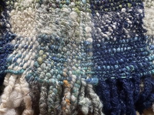 Each yarn has been hand spun on my Ashford Country Spinner and hand woven on my Ashford Rigid Heddle Loom in Northumberland. The fibres include merino wool, hand dyed Lincolnshire Longwool locks, sari silk, cotton, ribbon, recycled fibres, and a touch of Angelina sparkle for subtle luminosity.