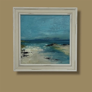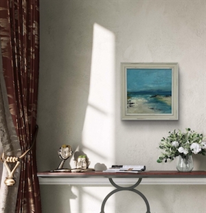 38 x 38cm framed in a cream distressed wood frame. Acrylic on board. Lose yourself in the calming blues of sea and sky with this original coastal landscape painting. Layers of colour and texture capture the shifting sand, soft grasses, and gentle tide rolling in — evoking the peace of a quiet shoreline. This one-of-a-kind seascape by UK artist Julie Gregory brings a sense of tranquillity and connection to nature, making it a perfect addition to a beach house, coastal-themed interior, or any space in need of a serene focal point. Signed original artwork, created with care and ready to be treasured.